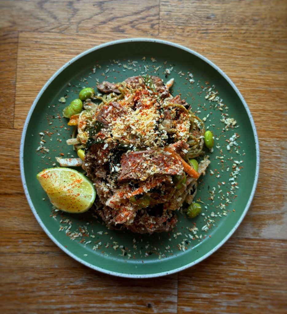 Wakame + edamame beans + green tea noodles + togarashi + wasabi panko