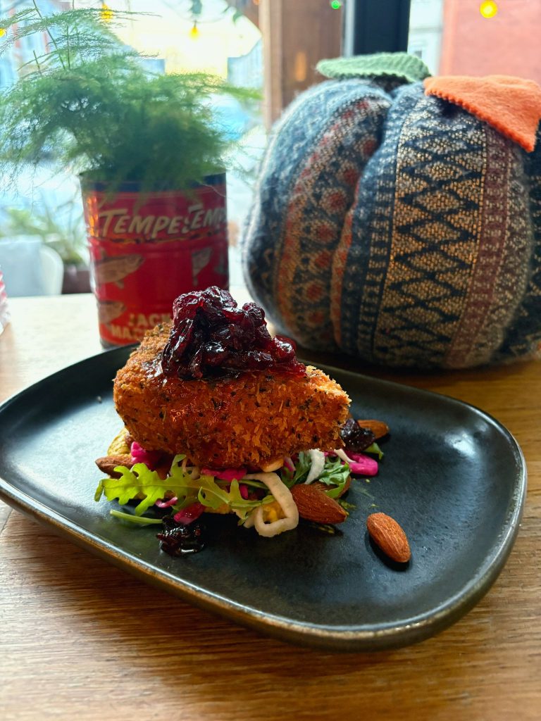 Sage panko + smoked almonds + hot honey cranberries + pickled veg + ras el hanout hommous