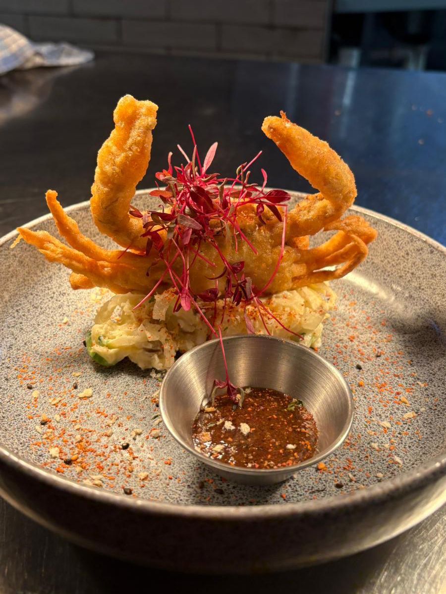 Japanese potato salad + prune tonkatsu + togarashi + wasabi panko